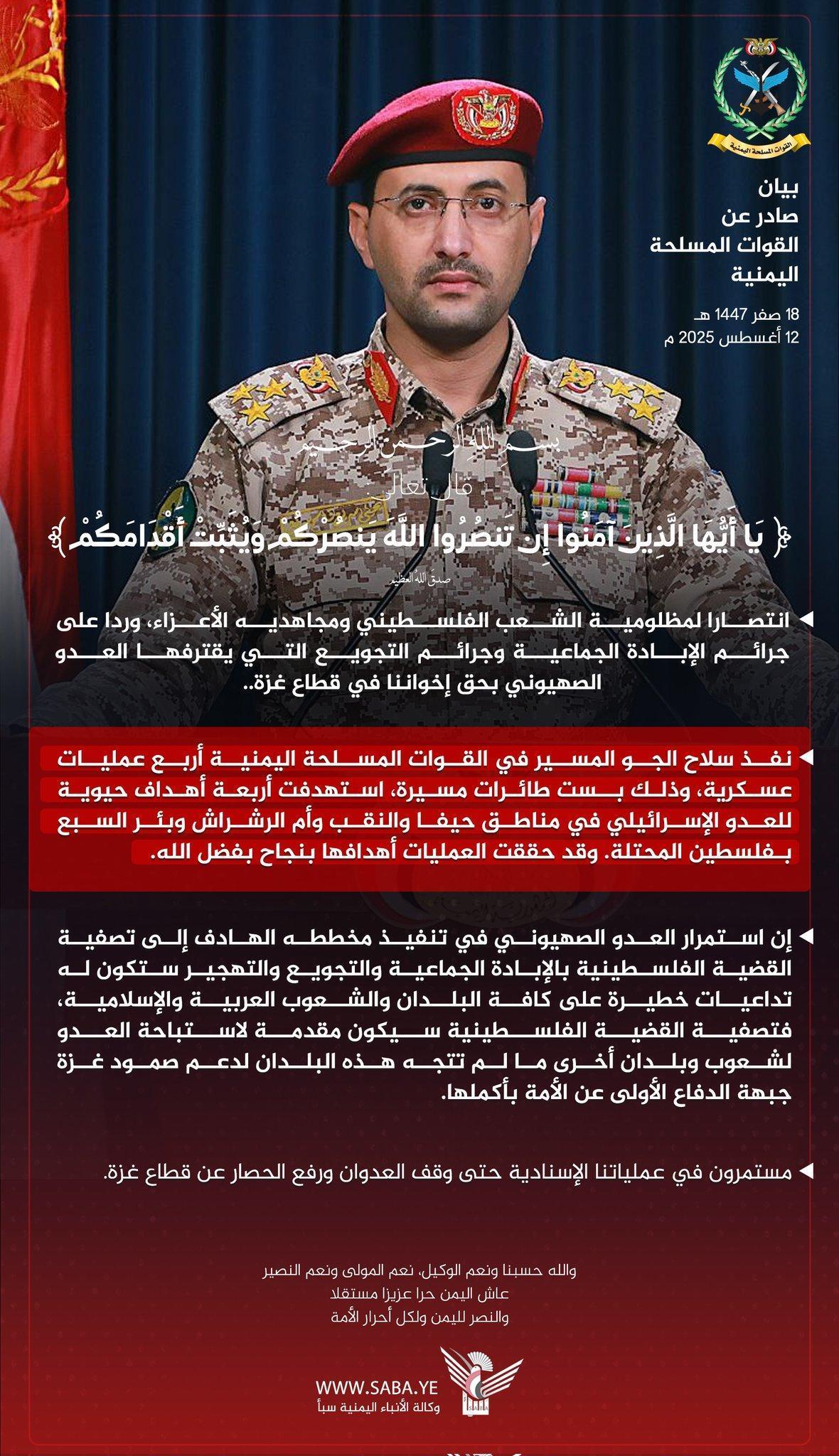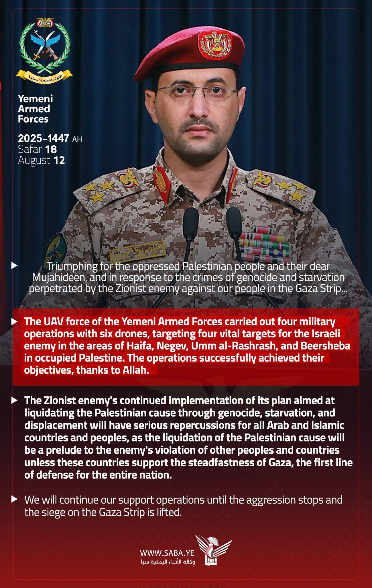 بيان القوات المسلحة اليمنية بشأن تنفيذ أربع عمليات عسكرية استهدفت أربعة أهداف حيوية للعدو الإسرائيلي في مناطق حيفا وأم الرشراش والنقب وبئر السبع بفلسطين المحتلة وذلك بست طائرات مسيرة. بتاريخ12_8_202