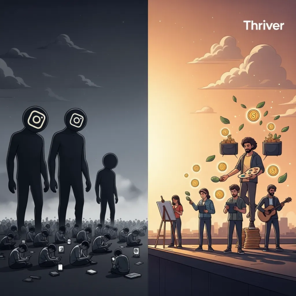 نحن نبني [Thriver] كبديل. منصة بسياسات عادلة، مراجعة بشرية، واقتصاد يضع المبدع أولاً.