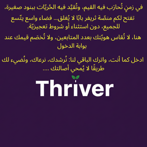 في زمنٍ تُحارَب فيه القيم، وتُقيَّد فيه الحُريّات ببنود صغيرة، تفتح لكم منصّة ثريفر بابًا لا يُغلق… فضاء واسع يتّسع للجميع، دون استثناء أو شروط تعجيزيّة.